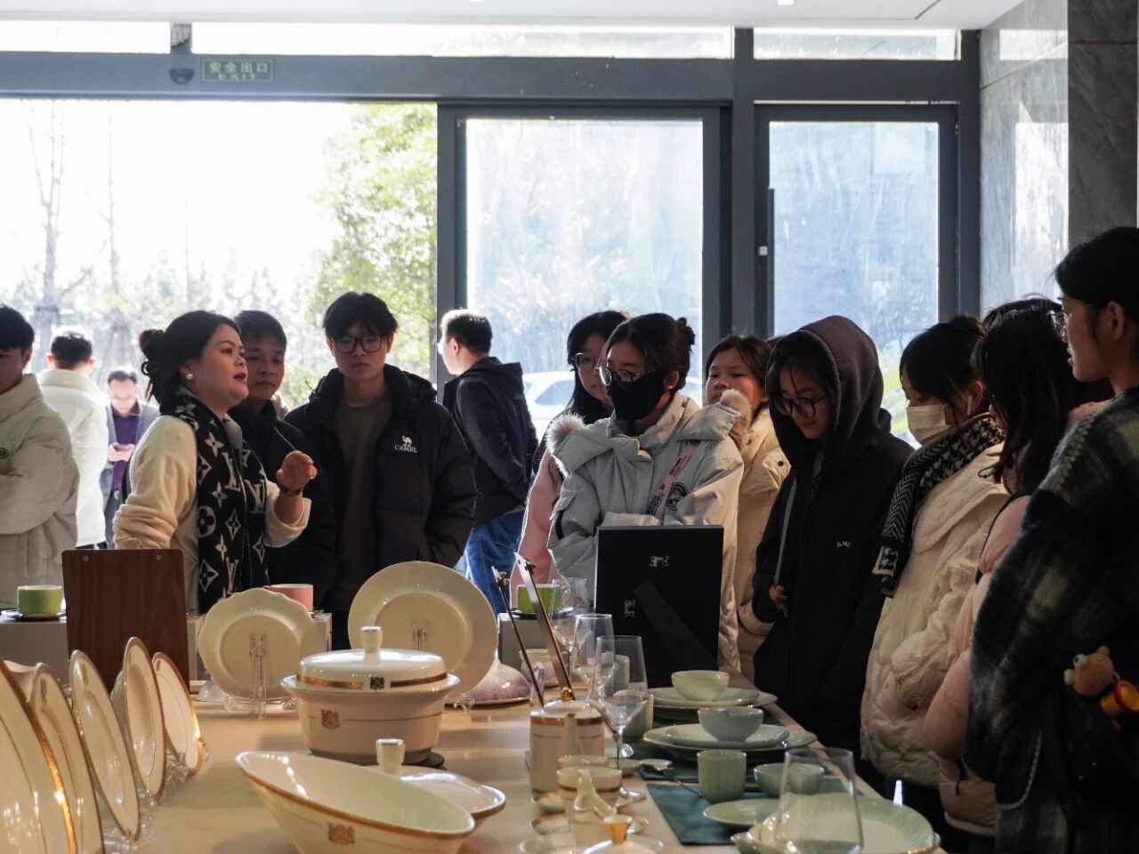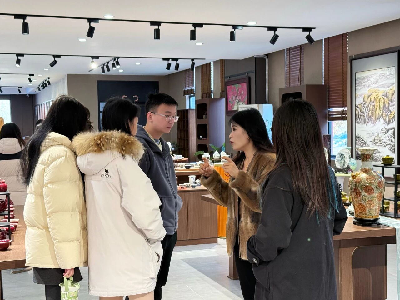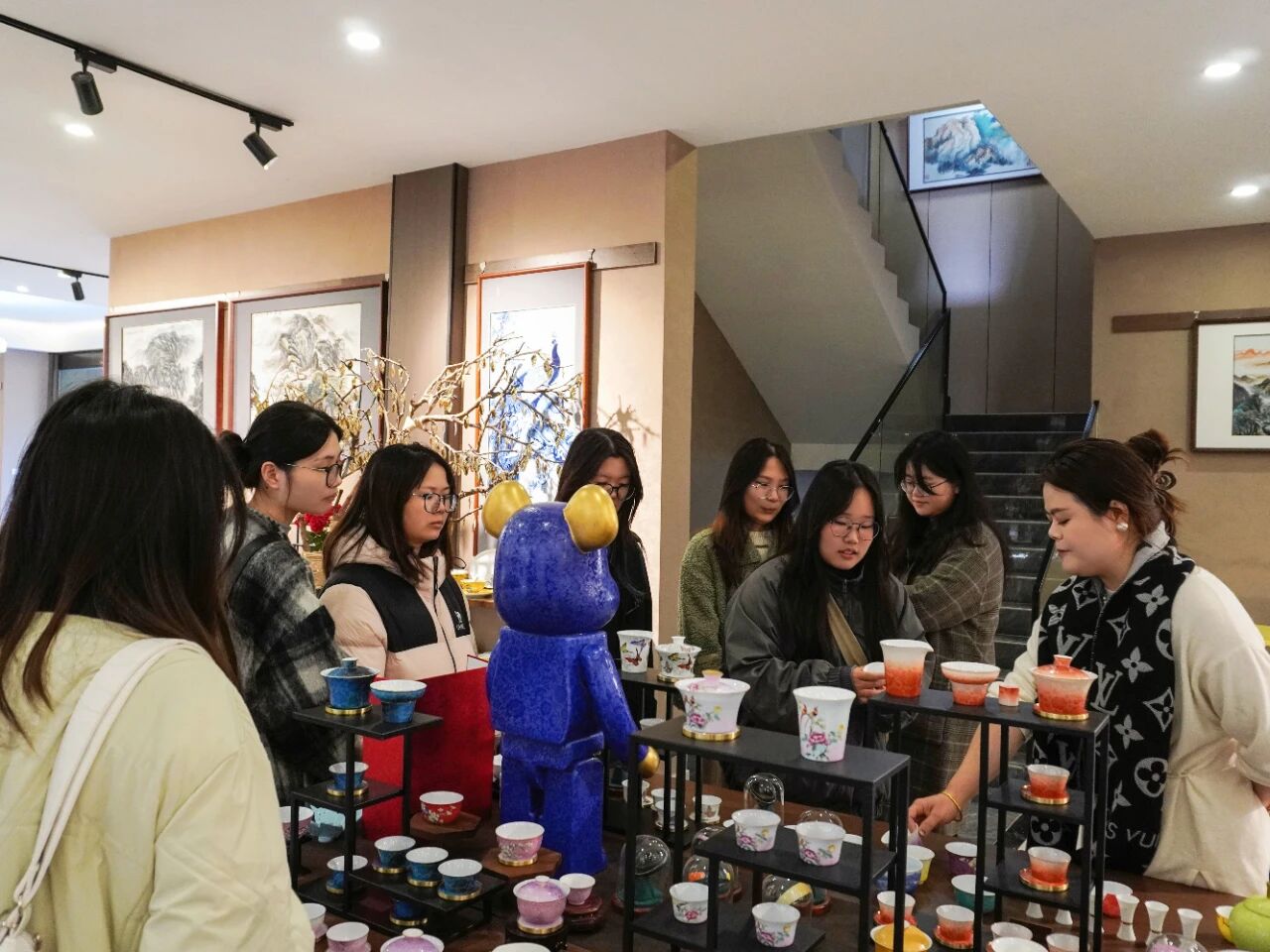 展覽區內,琳瑯滿目的陶瓷精品讓學生們駐足驚嘆。從典雅的青花瓷到絢麗的顏色釉,從精致的日用瓷到獨具創意的藝術擺件,辰天陶瓷展現了陶瓷藝術的多元魅力。負責人詳細講解了不同品類陶瓷的制作工藝與文化內涵,并現場解答學生們關于設計靈感、市場定位等問題。