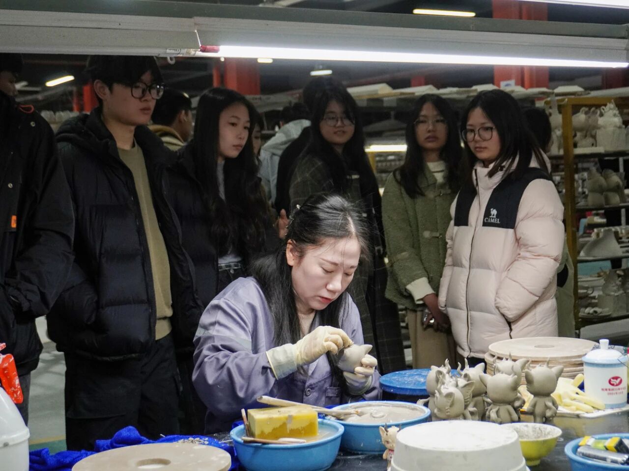 走進生產區,學生們目睹了陶瓷從原料成型到燒制出窯的全過程。在拉坯師傅的巧手下,器物線條愈發流暢;后又見證了操作員調色、施釉,在精細的操作中,坯體煥發出別樣光彩;以及素胚之上巧運靈思、妙筆生花的畫坯等工序后,企業技術人員還介紹了現代化生產設備如何與傳統工藝結合,提升生產效率與產品品質。